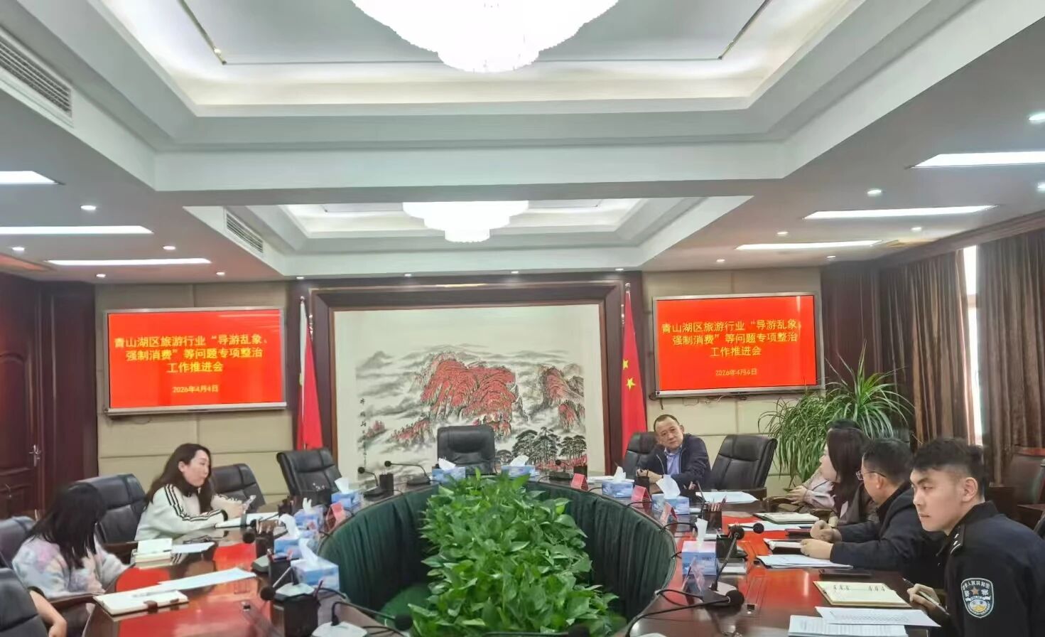 会议分两个阶段进行。第一阶段聚焦文物申报,区文广旅局局长万青宣读市级文保单位申报通知,区文保中心通报初步评审情况,湖坊镇、罗家镇就属地文物申报工作交流发言,明确申报流程与任务分工。第二阶段部署旅游市场整治,传达上级专项整治工作精神,围绕导游乱象、强制消费等突出问题细化工作举措,湖坊镇、京东镇、高新园区及市监、公安等部门依次发言,凝聚监管合力。