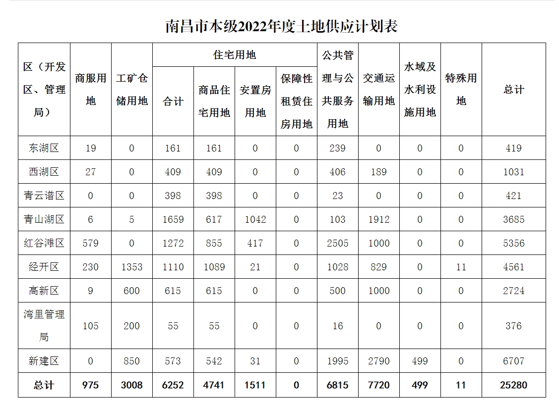 南昌市本级2022年度土地供应计划表